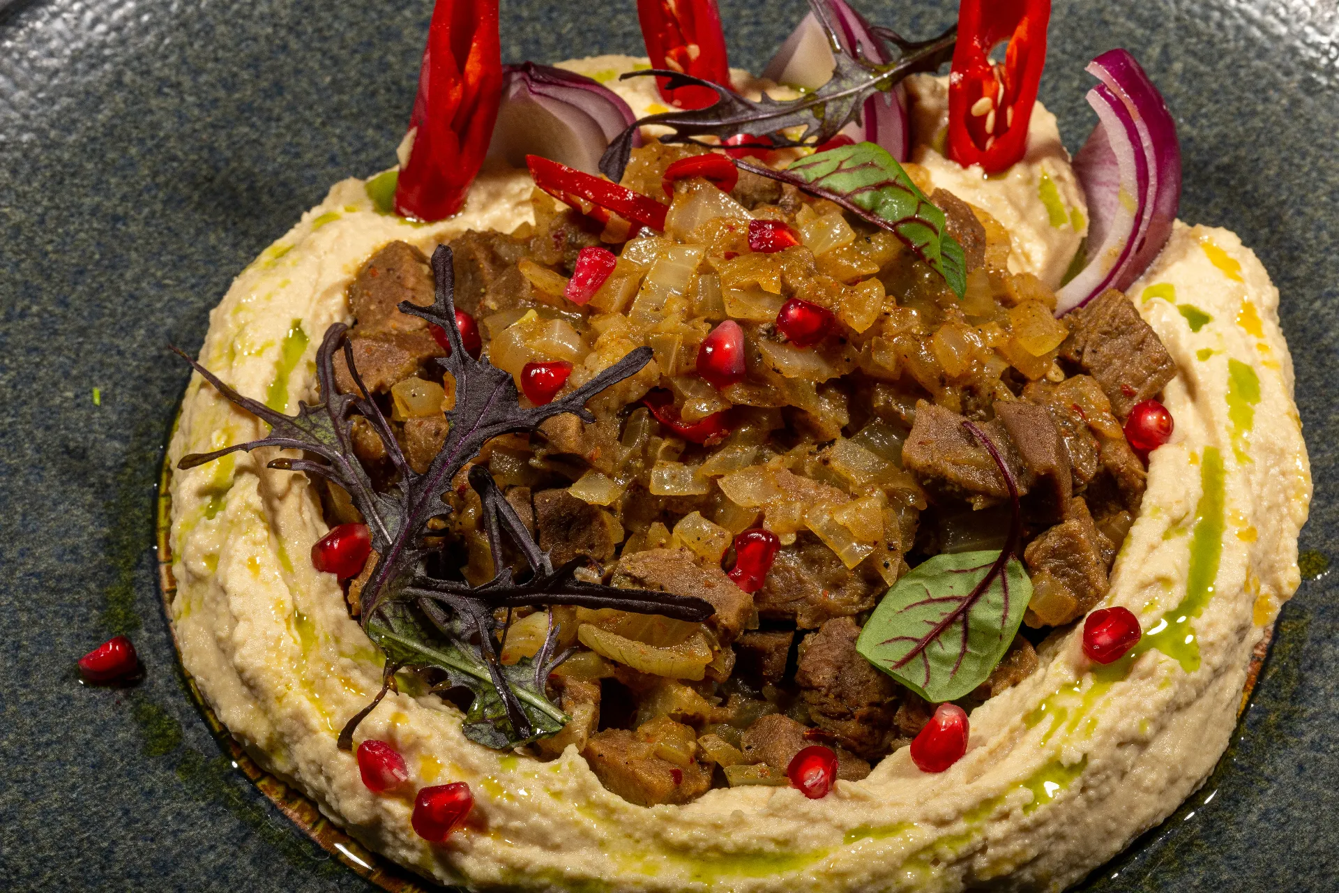 Pulpa de oaie 300 g,HUMMUS 226.5 g (Naut 187.5 g, Ulei de susan 30 g [Contine: Seminte de susan], Zeama de lamaie 4.5 ml, Usturoi 3 g, Sare 1.5 g),Ceapa uscata 150 g,Rodie 50 g,Ardei iute 40 g,Unt 20 g (Contine: Lapte) (Corectori de aciditate: E270 - Acid lactic),Sare 5 g,Usturoi 5 g