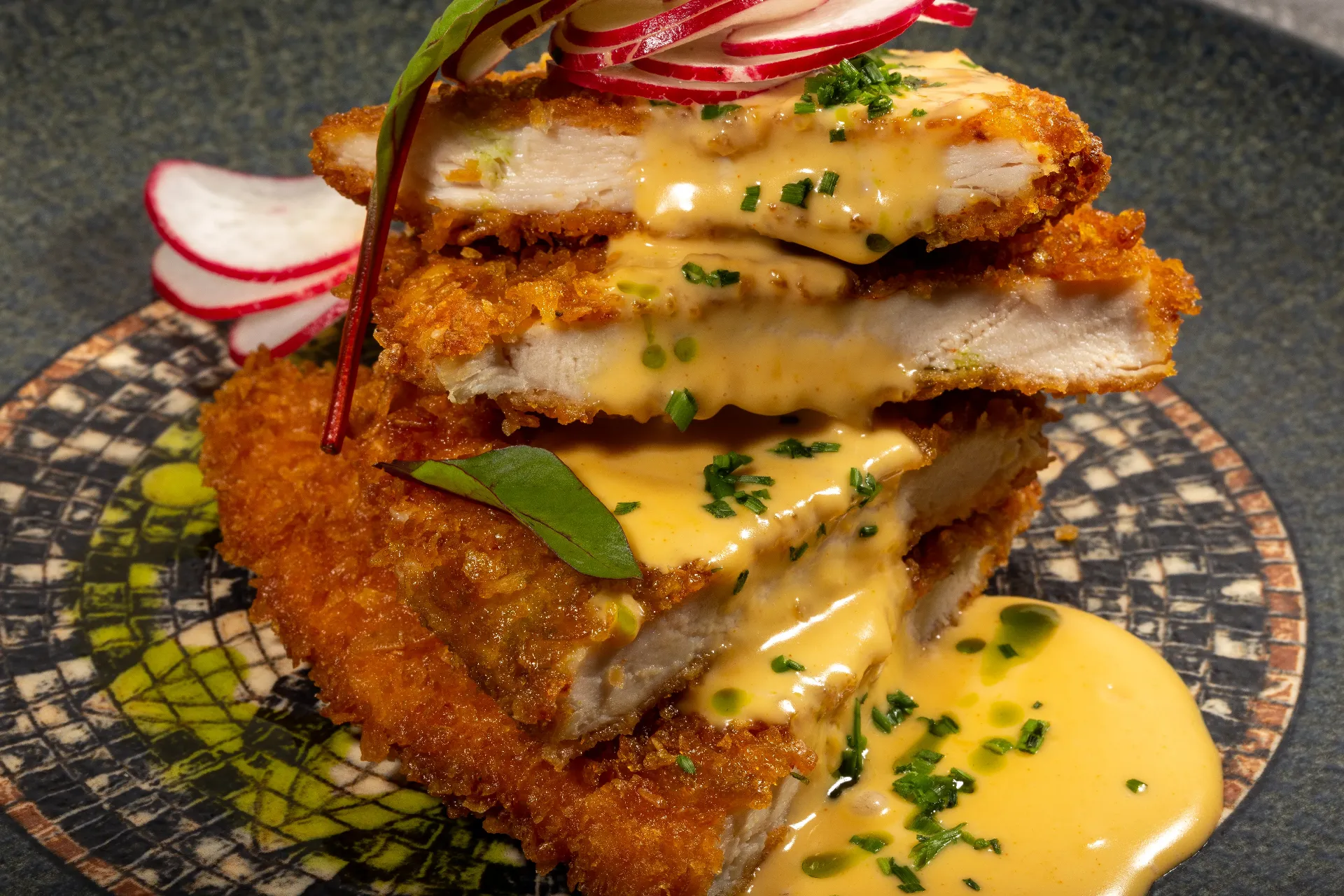 Snitel din piept de pui, fulgi de cereale, ridichi, chivas , sos cheddar