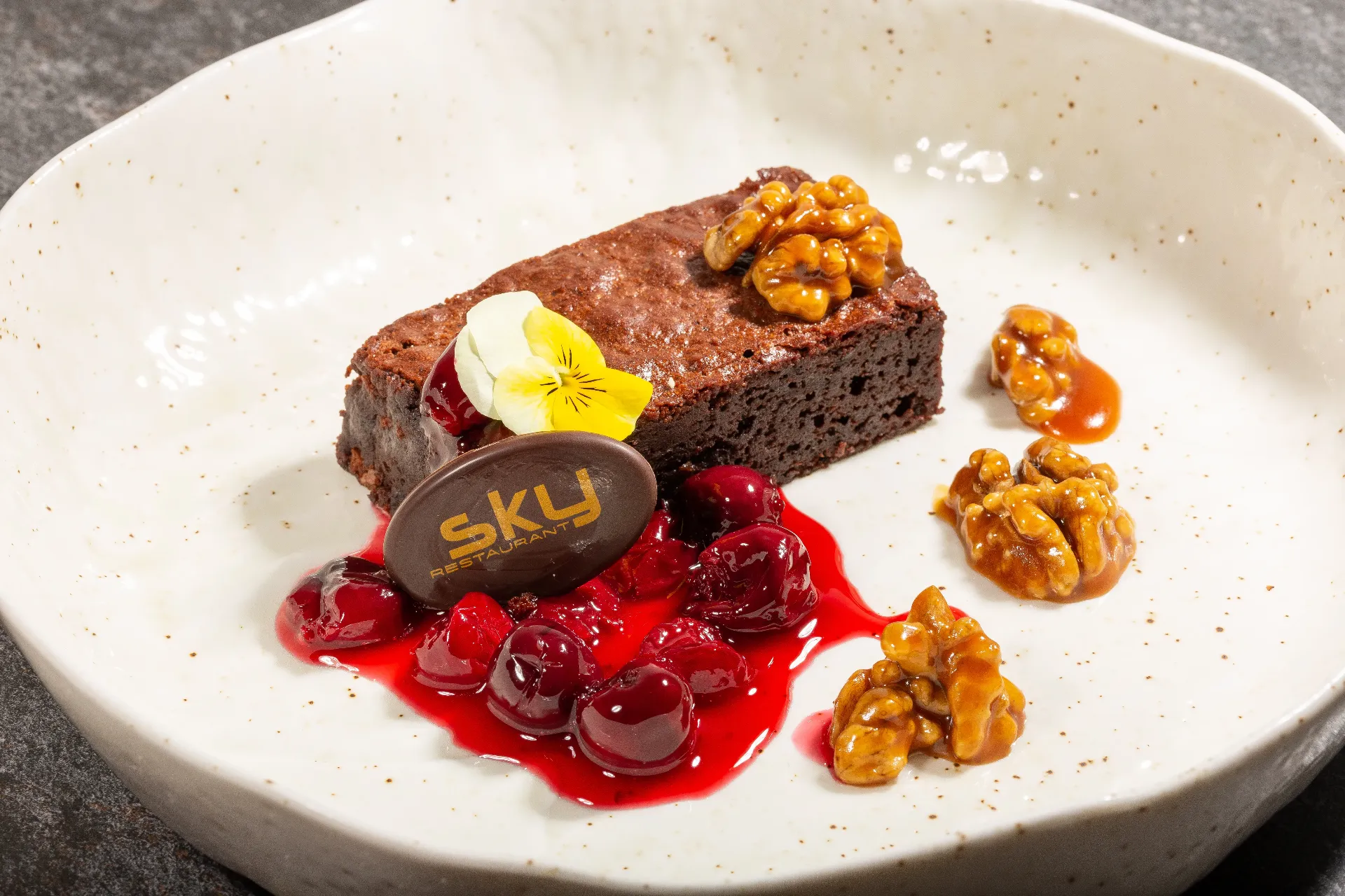 Negresa cu nuci caramelizate si sos de visine